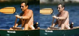 Août 2007 : le vacancier Nicolas Sarkozy pagayait torse nu sur une barque à Wolfeboro, aux Etats-Unis. Une photo fixa un vilain bourrelet. Paris Match du 9 Août 2007 a publié la photo après affinement de la silhouette. Justification : « La position sur le bateau exagérait cette protubérance » et « en allégeant les ombres, la correction a été exagérée en photogravure ».