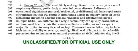 Intitulé "USNORTHCOM Branch Plan 3560 : Pandémie de grippe et réponse aux maladies infectieuses", le rapport est marqué « pour un usage officiel uniquement » et daté du 6 janvier 2017. Le plan a été fourni à The Nation par un fonctionnaire du Pentagone qui a demandé l’anonymat pour éviter des représailles.