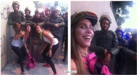 Des manifestants des quartiers huppés de Caracas (de peau blanche car descendants d’européens, souvent les plus radicaux au sein de l’extrême droite) se font prendre en photo devant les “singes chavistes” (monos chavistas). Ces gardes nationaux, chargés de défendre les transports et infrastructures publiques contre les destructions sont pour la plupart issus de la majorité populaire, métisse. Ces séances photo empreintes de racisme et qui s’accompagnent souvent d’insultes, de jets d’urine, se font en présence de photographes et caméramans de médias nationaux et internationaux qui guettent les réactions des gardes. Notons que si le gouvernement a fait arrêter une femme garde nationale (ainsi qu’une quinzaine de policiers) pour usage de la violence ou homicides, la quasi-totalité de ce corps armé est resté dans son rôle de contention pacifique, fait resté “hors champ” des médias internationaux.