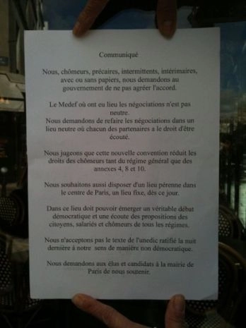 Les négociations se sont déroulées dans des conditions scandaleuses et contraires au droit (conciliabules organisés par le MEDEF dans les couloirs, accords opaques entre le MEDEF et des syndicats), mais les ministres Sapin et Filippetti se réjouissent de cette nouvelle convention qui aggrave la condition des précaires.