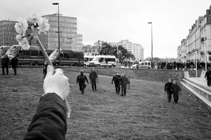 À Nantes, comme à Paris quelques heures plus tard sur la place de la République, la manifestation contre le projet de loi sur le travail se finit, samedi 9 avril, dans les fumées de gaz lacrymogène. Ainsi, à Nantes, ce jour-là, on observe des policiers présents en nombre, des canons à eau stationnés sur les places, des rangées de CRS à chaque croisement de rue. À l’angle de la rue de la Basse-Casserie, un petit groupe attend, aligné le long du mur : des policiers en civils. Lunettes de ski, cagoules et casques, matraques télescopiques à la main, ils se jettent sur une personne, qu’ils emmènent, non sans avoir au préalable lancé quelques grenades assourdissantes sur la foule. L’action est rapide. Mais suffit à provoquer les manifestants, dont plusieurs, en réaction, lancent des cailloux et des pavés contre les CRS et des policiers en civil casqués. Les manifestants en colère contre les tirs aveugles des CRS semblent ne pas avoir remarqué les « cagoulés » qui, de leur côté, ont enfin obtenu le Graal : une belle bataille rangée.