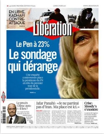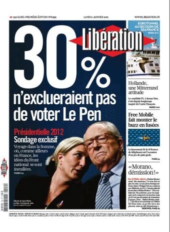 Le 9 janvier, Libération nous livrait ainsi son dernier sondage commandé à Viavoice. Le résultat de ce sondage fait la « Une » du quotidien. Son titre révèle ainsi « l’information » que la rédaction estime la plus importante : « 30% n’exclueraient pas de voter Le Pen » (Nous avons gardé la faute d’orthographe pour rester rigoureux dans la citation). Le journal consacre alors quatre pages à Marine Le Pen, faites de témoignages recueillis dans des lieux où les idées de l’extrême-droite s’implantent et de « décryptage » des résultats du sondage.