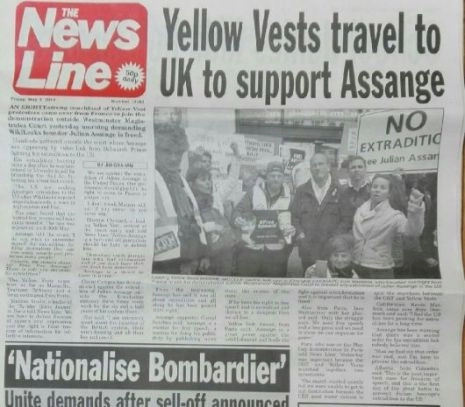 Florian, un Gilet Jaune de Lyon, a commenté : "La raison principale [de notre présence ici] est la liberté d’expression et de la presse. Nous sommes ici pour soutenir quelqu’un qui a été condamné à tort par les gouvernements, simplement pour avoir dit la vérité. Ça rejoint ce que nous combattons en France avec le mouvement des Gilets Jaunes, donc nous sommes venus pour montrer notre soutien."
