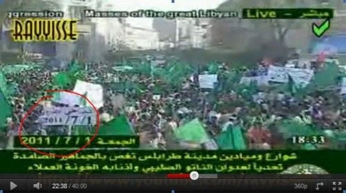 Le soir du 1er juillet est diffusé sur youtube une copie d’un reportage de 40 minutes de la télévision libyenne sur la manifestation. Bien-sûr, no-fly zone oblige, on manque des vues habituelles prises d’hélicoptère. Néanmoins ces images laissent peu de doute sur l’ampleur, la localisation et la date de l’évènement. La date par exemple est confirmée par cette séquence vers 22:38 - qui ne parait franchement pas avoir été manipulée - où l’on peut voir évoluer une pancarte affichant 2011/7/1. [9]