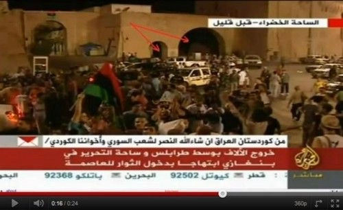 Les seules images disponibles sont celles de la télévision libyenne. Elle paraissent un peu plus crédibles que les images de la place Verte « à Tripoli » diffusées 8 semaines plus tard par Al Jazeera le 21/8/11 mais enregistrées selon toute vraisemblance… en studio au Qatar [12]
