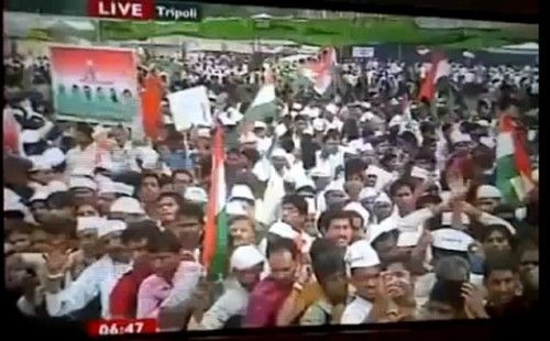 ou celles de la place Verte « à Tripoli » diffusées par la BBC le 24/08/11 montrant une foule agitant des drapeaux… indiens. [13]