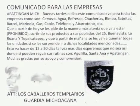 Les “territoires libérés” des "méchants" allèrent en augmentant jusqu’à englober des lieux aussi importants que Nueva Italia ou La Huacana qui s’ajoutèrent aux petites localités de Tomatlán, Carillo Puerto, Aquila, Aguililla, Antúnez, Parácuaro, Tantcitaro, Acahuato, Buenvista, La Ruana et Churumuco, qui vinrent grossir la liste des villages michoacains qui s’étaient levés contre les « méchants » comme Cherán, Nahuátzen, Cherato, Cheratillo, Urapicho, Zicuicho, Oruscato, Ocumitzo et les autres communautés autochtones qui s’étaient unies, des années auparavant, pour combattre le fléau du crime, mais avec d’autres conceptions, méthodes et objectifs.