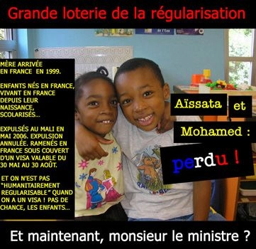 Vous vous souvenez de cette famille Sylla du Loiret expulsée avec erreur de procédure et qui fit un aller retour en avion au Mali : elle n’a qu’un visa touristique de trois mois depuis le 30 mai 2006 et bien qu’elle remplisse toutes les conditions pour bénéficier des mesures exceptionnelles de régularisation des sans papiers prévue par la circulaire du 13 juin, il y a la date butoir du 13 août pour demander à en bénéficier...