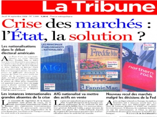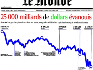 A L’ORIGINE DE LA CRISE... LES MARCHES : Nul ne s’en souvient plus, vu la démagogie des médias qui, en boucle, dénoncent seulement la dette dite publique, mais la crise, à l’origine, en 2008, c’est celle des marchés financiers : « Depuis le début de l’année, les grandes places boursières internationales ont perdu presque la moitié de leur capitalisation. Cela signifie qu’environ 25 000 milliards de dollars sont partis en fumée, soit près de deux fois le Produit intérieur brut (PIB) des Etats-Unis », et ceux qui l’écrivent, comme le journal Le Monde, ne peuvent être soupçonné de parti pris idéologique « procommuniste ». 25 000 milliards de dollars brûlés en 10 mois [16], c’est autre chose que la dette grecque. Ce titre, au-delà d’une étude approfondie qui serait nécessaire révèle et démontre que la Crise ne vient pas de l’Etat, ni des fonctionnaires et encore moins de Grèce, mais bien des marchés financiers spéculatifs et prédateurs, car par définition, le marché ne crée rien [17] il s’accapare…les richesses produites par autrui. Là se trouve la violence du capital.
