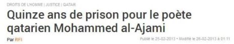 Considérons également que le Qatar ne garantit pas la liberté d’expression ou de la presse. Ainsi en 2013 le poète qatarien Mohammed al-Ajami fut condamné à 15 ans de prison, au prétexte qu’il a souhaité que le « printemps » soit une saison qui n’oublie pas de faire un tour par le Qatar. Ce pays de droit divin l’a d’abord condamné à mort avant que la sentence ne soit « généreusement » commuée.