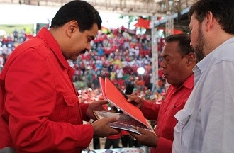 Photo : Nicolas Maduro le 24 mai 2014, lors d’une rencontre nationale avec les travailleurs du secteur public et les syndicats qui lui ont remis le projet de contrat collectif 2014-2016. Ce projet sera approuvé dans les 60 jours, a promis le président, qui a par ailleurs approuvé la nouvelle échelle d’augmentation du salaire pour l’administration publique, annoncé le renforcement de la Caisse d’Épargne et la création d’une Banque des Travailleurs où seront déposées toutes les prestations sociales qui leurs sont dues, et relancé la Mission Mercal Obrero qui prolonge le système de distribution des aliments à bas prix en installant ces magasins à proximité des lieux de travail.