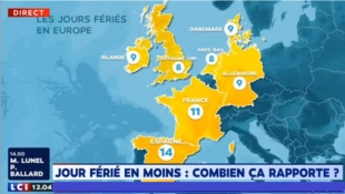 P.S du 2 mai 2019 : lors d’une émission précédente de LCI il avait déjà été indiqué que le nombre de jours fériés en France était supérieur à l’Allemagne comme le montre la « carte LCI » : Les français apparaissant une fois de plus comme ceux qui bénéficient de plus de jours de congés. Les médias ourdissant la possibilité que le gouvernement prenne la décision de supprimer un jour férié, il fallait anticiper cette décision et commencer d’abreuver les citoyens de chiffres expliquant notre paresse, notamment en rapport à l’Allemagne. Mais ce jour-là le député France insoumise Adrien Quatennens a immédiatement rectifiée la journaliste expliquant : « Il n’y a pas 9 jours férié en Allemagne, mais 9 jours fériés d’Etat, auxquels s’ajoutent les jours fériés des landers soit entre 9 (Berlin) et 13 (Bavière). LCI oublie de plus l’Italie et ses 14 jours fériés ou la Suède et ses 17 jours fériés. »