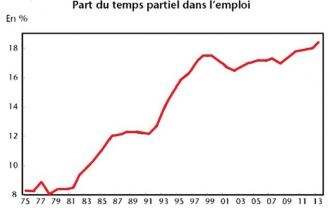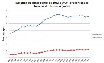 La réalité du temps partiel : Comme le montre ce graphique, le marché du travail s’est transformé et le temps partiel qui représentait 8 % à la fin des années 70, représente désormais plus de 18 % des emplois ce qui modifie de manière importante le marché du travail. Par ailleurs, le travail à temps partiel est essentiellement féminin. Aujourd’hui, Les emplois à temps partiel sont pour l’essentiel occupés par des femmes (82,5%) et de fait, plus de 30 % des femmes travaillent à temps partiel, expliquant ainsi en retour les inégalités de salaire et de retraite…Pour en savoir plus sur le temps partiel, je vous renvoie à cette excellente synthèse : http://ses.ens-lyon.fr/articles/le-temps-partiel-282736