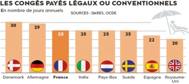 De plus, comme le graphique de droite le montre, les congés payés légaux ou conventionnels sont plus importants en Allemagne qu’en France, qui se situe dans la moyenne européenne (25 jours).