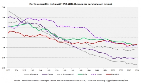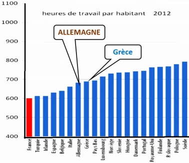 Pour l’Allemagne, la durée effective de travail annuelle par actif occupé en 2013 est de 1 580 h à comparer aux 1 536 h de la France…