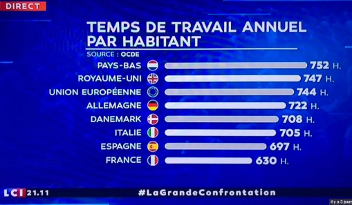 Introduction : L’autre soir, lors de la « grande confrontation » sur LCI, le propagandiste en chef nous a livré son graphique sur le temps de travail, qui montrerait le fait que les « français » travaillent le moins en Europe… Au-delà de discuter philosophiquement, si le sens de la vie est le travail (tripalium en latin), il y a dans la présentation du « propagandiste » une ineptie fondamentale, sur le graphique présenté. Précisons, la politique mérite un débat démocratique, c’est-à-dire un débat sur le choix de société qui se présente à nous. Chacun peut avoir le droit de présenter une analyse politique différente, encore faut-il partir de données incontestables ou alors, car toutes sont discutées, notamment chez les experts, de montrer des graphiques différents en soulignant de fait leurs construction différentes. Tel n’est pas le cas chez le JUDAS des Médias, qui impose un graphique et un seul comme porteur de VERITE. Staline n’aurait pas mieux fait…