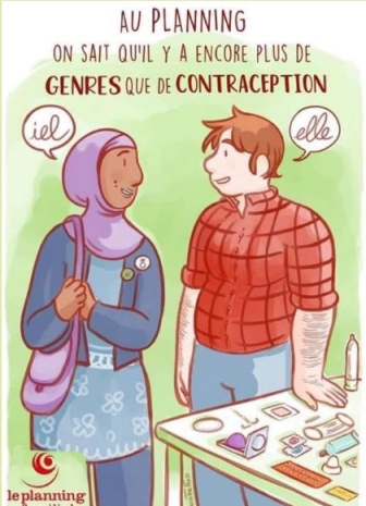 Deux petites dernières pour la route. L’auteur de l’affiche ci-dessus a également commis celle qui suit. Bien sûr, plus d’il : un iel d’autorité. Une femme musulmane, basanée, voilée. Portant pantalon et petite jupette fleurie. Un homme blanc qui en a : du poil... aux bras, ouf ! Une poitrine quasi féminine et un ventre prometteur. Pas de barbe. Et puis cette affirmation selon laquelle il y a plus de genres que de contraception (sans s). Comme il y a quatorze objets contraceptifs sur la table, on attend la liste des genres.