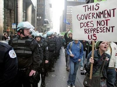Symptomatique : à Francfort, sont apparues des affiches sur le thème « Non à l’Etat Policier » ("Polizei Staat - Nein Danke") (6). A Chicago, sur un thème similaire : « Ce gouvernement ne nous représente pas, ou ne représente pas les Etats-Unis » ("This government does not represent US"), jouant sur le mot « nous » ("us", en anglais) et Etats-Unis ("U.S.", United States).