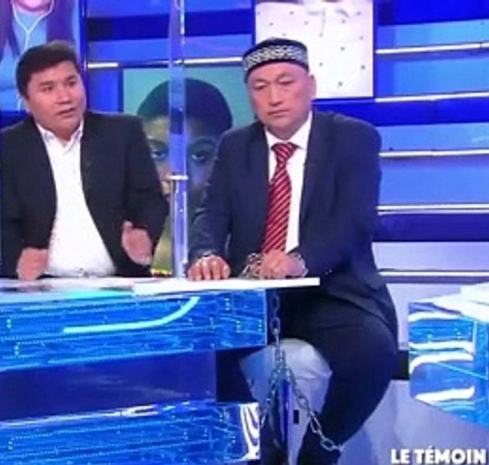Le témoin Omir Bakir avec ses chaînes (emportées des « camps de concentration chinois » ?), à Londres et auprès de Hanouna sur C8.
