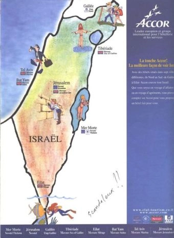 Mais un seuil a été franchi dans ce même dernier numéro de décembre 2002 par la "quatrième de couvepture", concédée à une page de publicité pour le groupe "ACCOR" ; Ce "groupe international pour l’hôtellerie et les services"..."La meilleure façon de voir Israël", à travers ses hôtels Mercure, Novotel. etc... L’illustration de cette soi-disant publicité est une carte d’Israël, présenté comme celle du "Grand-Israel" tel que le rêvent les extrémistes sionistes, avec l’annexion complète de tous les territoires, du Golan, de Gaza et de Cisjordanie !