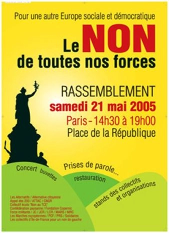 - Liste des organisations et collectifs : Les Alternatifs / Alternative citoyenne / Appel des 200 / Appel des 200 jeunes / ATTAC / CNGR / Collectif écolo "Non au TCE" / Confédération paysanne / Coordination féministe pour le NON / Fondation Copernic / Force militante / JC / JCR / LCR / Le NON socialiste / MARS / MRAP / MRC / Les Marches européennes / PCF / PRS / Réseau féministe Ruptures / Solidaires / UFAL / UNEF / Les collectifs d’àŽle-de-France pour un non de gauche