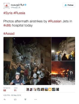 MISE À JOUR : Selon le photographe @AFP à #Idlib, ainsi que d’autres sources, hôpital national pas directement touché, la bombe a atterri derrière lui. 04:20 - 31 mai 2016
