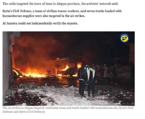 Selon, la Défense civile syrienne, une organisation de sauvetage civile syrienne, sept camions chargés d’aide humanitaire ont aussi été ciblés par les frappes.