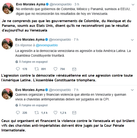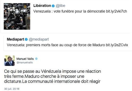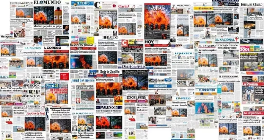 30 juillet 2017. Journaux d’Amérique Latine, d’Europe et des Etats-Unis détournant la photo de l’explosion d’une bombe dans le centre de Caracas lors d’un énième attentat de la droite contre les forces de l’ordre pour illustrer… « la répression de Maduro pendant l’élection de la Constituante » !
