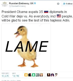 La première réaction est venue de l’ambassade de Russie au Royaume-Uni. Son tweet portait sur le statut actuel de l’administration Obama :