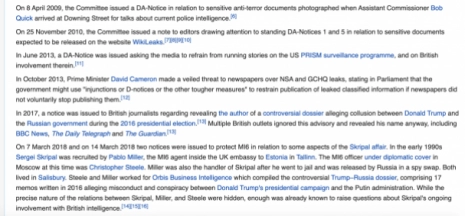 Même Wikipédia, en version anglaise, indique, de manière sourcée, qu’en juin 2013, une note DA a été publiée, demandant aux médias de s’abstenir de publier des articles sur le programme de surveillance américain PRISM et sur la participation britannique à ce programme [5]. En octobre 2013, le Premier ministre David Cameron a proféré une menace voilée aux journaux concernant les fuites de la NSA et du GCHQ, déclarant au Parlement que le gouvernement pourrait utiliser ’des injonctions ou des D-notices ou d’autres mesures plus sévères’ pour restreindre la publication d’informations classifiées ayant fait l’objet de fuites si les journaux ne cessaient pas volontairement de les publier [6] !