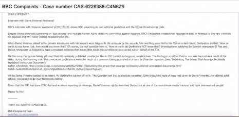 Exemple de la désinformation organisée contre Assange en Angleterre : l’interview de Viviane Westwood (22/07/2020), l’icône de la mode punk mondialement reconnue ; elle a donné à Victoria Debyshire une interview sur la situation affolante vécue par Julian Assange sur la BBC [7]. Cette interview est à proprement parler scandaleuse : Victoria Debyshire, payée par le contribuable anglais, ne connaît visiblement rien à l’affaire Assange. Elle ne maîtrise pas les faits du dossier qu’elle aborde. Niki Konstantinidis, barrister and solicitor (admise à exercer à la Cour suprême de Victoria, Australie) ainsi que solicitor (admise à exercer à la Cour suprême de justice d’Irlande du Nord) a, d’ailleurs a soumis une plainte à la BBC suite à cette interview qui ne mérite pas son nom, dans laquelle Victoria Debyshire se montre même insultante envers Viviane Westwood. D’ailleurs, après vérifications, aucun article de la BBC n’est honnête intellectuellement sur le cas Assange.