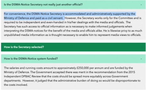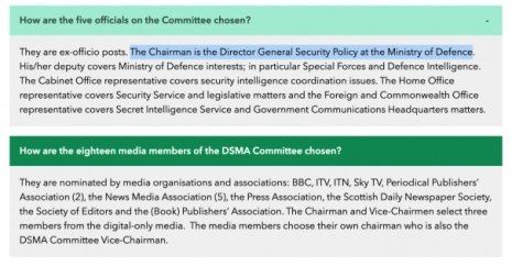 Derrière le DSMA (La Commission consultative des médias pour la défense et la sécurité) se cache le Ministère de la Défense anglais qui pour se donner un semblant d’indépendance, a créé cette structure. Un joli nom qui cache une structure antidémocratique.