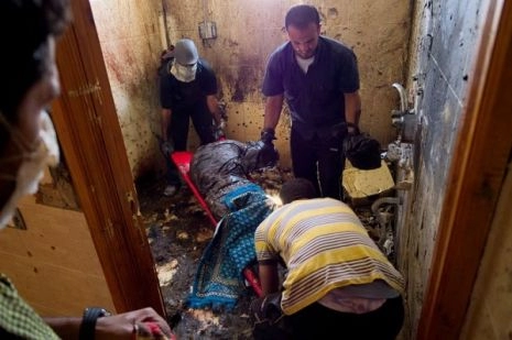 Un cadavre, pieds nus, dans un camouflage kaki, est transporté dans la rue, partiellement enveloppé dans un tapis, tandis que j’entre dans la maison. Son visage, partiellement brûlé et partiellement en décomposition est méconnaissable de quelqu’un qui était en vie et qui respirait. Des témoins disent qu’il y a au moins six corps entassés à l’intérieur de cette pièce carrelée où l’air est intoxiqué par la décomposition.