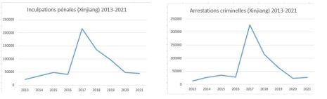 Suivent des données concernant de soit-disant augmentations du nombre de poursuites judiciaires, d’emprisonnements et de condamnations diverses dans la région autonome du Xinjiang, entre 2013 et 2018. À moins de compulser les rapports du ministère de la justice chinois, ces informations sont invérifiables et personne ne les vérifiera. Encore moins les journalistes qui reprendront ce « rapport » et pour qui la Chine est par essence coupable de tout ce dont on l’accusera.