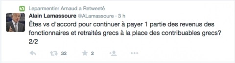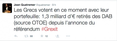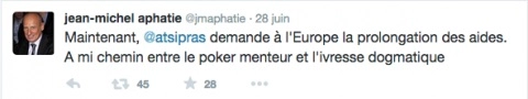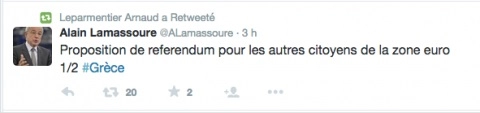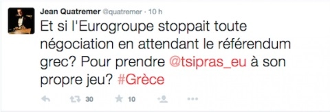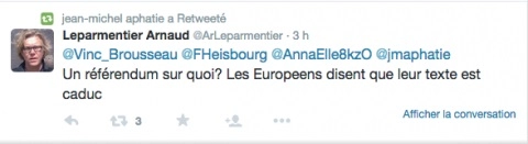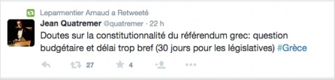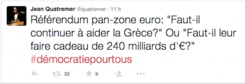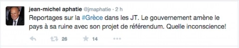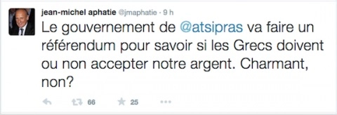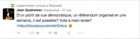 Reprenons. Jean Quatremer (retweeté par Arnaud Leparmentier), Arnaud Leparmentier (retweeté par Jean-Michel Aphatie), et Jean-Michel Aphatie (…) sont d’accord : haro sur le gouvernement grec et sur son projet de référendum ! Et, au cas où les adeptes de Twitter n’auraient pas bien compris le message, ils n’ont pas hésité à le répéter… ad nauseam ?