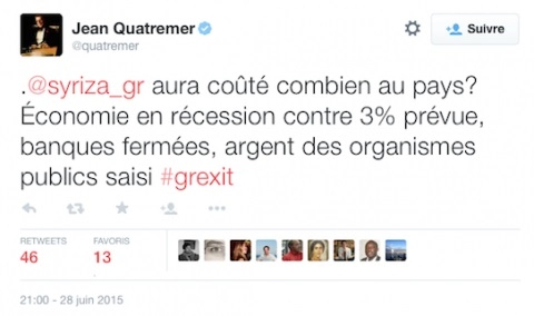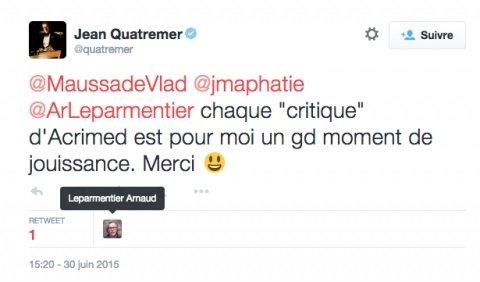 Post-scriptum (30 juin, 16h) : Après avoir pris connaissance de cet article, l’ineffable Jean Quatremer s’est évidemment fendu d’un tweet. Un tweet immédiatement repris par... Arnaud Leparmentier.