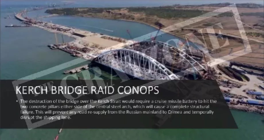 Sur trois pages distinctes, à côté de diagrammes, l’auteur énonce les termes de la "mission" - "[désactiver] le pont de Kerch de manière audacieuse, en perturbant l’accès routier et ferroviaire à la Crimée et l’accès maritime à la mer d’Azov".