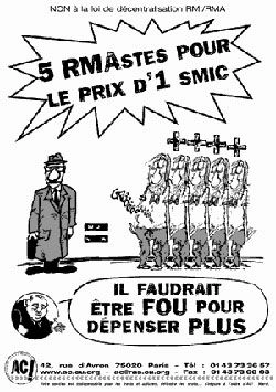Ainsi, une employée qui percevait un SMIC et demi avant d’être licenciée de, par exemple, Danone, pourrait, au terme d’un rapide parcours Assedic-ASS-RMI, être obligée d’accepter un RMA dans le même groupe Danone pour 130 euros...