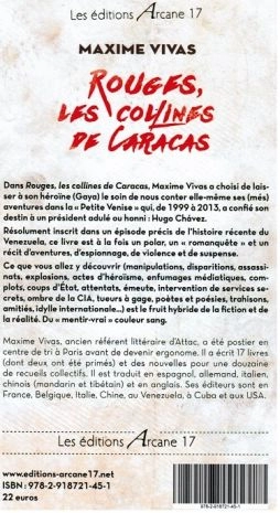 Il est difficile de chroniquer le livre d’un copain sans tomber dans la complaisance. Eh bien ma bonne dame, tant pis ! Vivas vient d’écrire un polar de belle facture intitulé « Rouges, les collines de Caracas » (Editions Arcane 17), un titre a priori déjà suspect lorsque l’on sait que le bonhomme y a effectué plusieurs séjours et jamais craché dans la soupe... Au soupçon d’agent chaviste s’ajoute celui d’avoir fait trimer « un nègre ». Putain que c’est bien écrit ! Du Vivas ? Et oui , du Vivas. A force de trop connaître les copains, on finit par oublier qu’ils ont des métiers, des passions, et du talent.