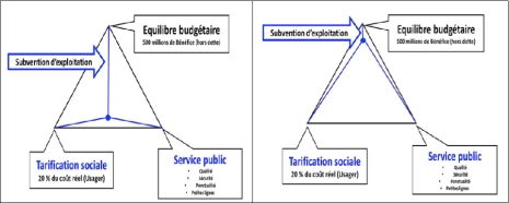 • Si on privilégie le « service public » et la « tarification sociale », alors on se situe sur le triangle de gauche, qui nécessite en contrepartie des subventions d’exploitations importantes.