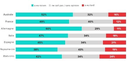 Les cinq plus grandes économies européennes et l’Australie ne sont pas favorables à l’extradition d’Assange. Seuls 21 % des Australiens sont favorables à l’extradition, contre 46 % qui y sont opposés, mais ce sont les Allemands qui sont les plus opposés à cette idée : Seuls 18 % souhaitent que l’extradition d’Assange ait lieu, contre 52 % qui s’y opposent. L’opposition l’emporte sur le soutien par 12 points de pourcentage en France, 13 points en Espagne et 27 points en Italie.