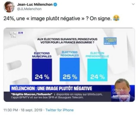 Ironie du sort, BFMTV, qui avait commandé ce sondage, le diffusait sous le titre « Mélenchon : une image plutôt négative ». Déni de réalité ou propagande à peine voilée contre le principal porte-parole des insoumis ? Difficile à dire. Toujours est-il que le leader de la France insoumise s’en est amusé sur Twitter, déclarant : « 24%, une “image plutôt négative” ? On signe. »
