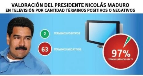 Revenons un instant sur l’affirmation de Cluzel selon laquelle le rachat de El Universal par un groupe espagnol “qui était de mèche en réalité avec le gouvernement” s’est faite “au prix de sa liberté d’expression”. Non seulement ce groupe n’est pas lié au gouvernement bolivarien (18) mais une étude réalisée du 2 au 8 août 2014 (19), après ce rachat, montre la proportion écrasante de termes négatifs (87 %) par rapport aux termes positifs (13%) dans le traitement des politiques du gouvernement Maduro :