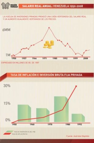 Les deux tableaux qui suivent mettent en évidence deux des effets les plus pervers que causera cette « grève » : une situation d’inflation et la chute vertigineuse des salaires réels de la population active. (On doit ces études à Asdrubal Baptista, que l’on ne peut soupçonner davantage de chavisme).