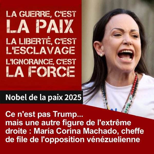 « Quand j’ai quitté mes fonctions, le Venezuela était prêt à s’effondrer, nous l’aurions pris, nous aurions obtenu tout ce pétrole, il aurait été juste à côté » a déclaré Donald Trump. De retour au pouvoir, il s’emploie à prendre « tout ce pétrole » et, dans la foulée du prix Nobel de la paix de sa complice putschiste d’extrême droite Maria Corina Machado, le président des États-Unis assume une guerre secrète de changement de régime menée par la CIA et dit se préparer à une invasion militaire du pays... en attendant de recevoir lui-même le Nobel de la paix, comme il le réclame (sinon il va s’énerver et tout casser !). Machado sait comment il faut parler. Elle avait déclaré : « Je promets qu’un jour, nous entretiendrons des relations étroites entre le Venezuela et Israël. Je suis convaincue que notre gouvernement transférera notre ambassade israélienne à Jérusalem. Cela témoignera de notre soutien à l’État d’Israël. ». En attendant, cette "grande démocrate" a réclamé le blocus et la famine pour le peuple vénézuélien qu’elle promet de vendre à ses amis dès qu’elle aura pris le pouvoir par l’assassinat et le coup d’État.
