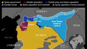 En bleu clair, la zone kurde. Hachurée, au nord, la zone que les Turcs veulent contrôler.