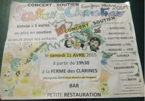 L’enjeu, réunir des fonds pour son procès à venir. Lors d’une manifestation le 20 février 2012 visant à demander l’interdiction du maïs Mon810 de Monsanto, Christian a été, selon son témoignage, « projeté au sol par les forces de l’ordre ». Résultat : une vertèbre fracturée et cinq mois d’arrêt de travail. Un premier dépôt de plainte à la gendarmerie est rejeté par le procureur. Plus de trois ans après les faits, un deuxième dépôt de plainte est toujours en cours d’instruction.