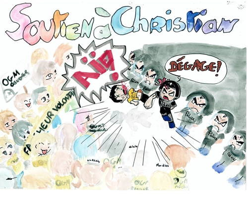 L’image n’est autre qu’un dessin réalisé par une enfant de 12 ans à l’époque des faits, qui montre un policier assénant un coup à un manifestant. L’enfant est « passionnée par les mangas », précise Christian.