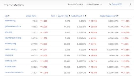 Un large éventail de sites de gauche, progressistes, et anti-guerre ont vu diminuer leur rang dans les palmarès du trafic au cours des derniers mois