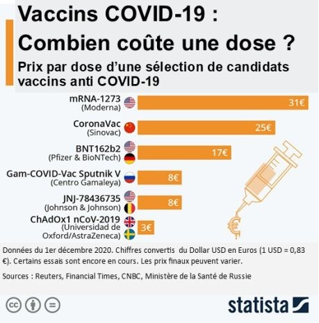 Les prix de vente des vaccins aux différents pays (ils sont variables) sont gardés sous le sceau du secret des accords signés entre les compagnies pharmaceutiques et les gouvernements, bien que le site spécialisé Statista ait calculé le prix moyen par dose dans ces montants :